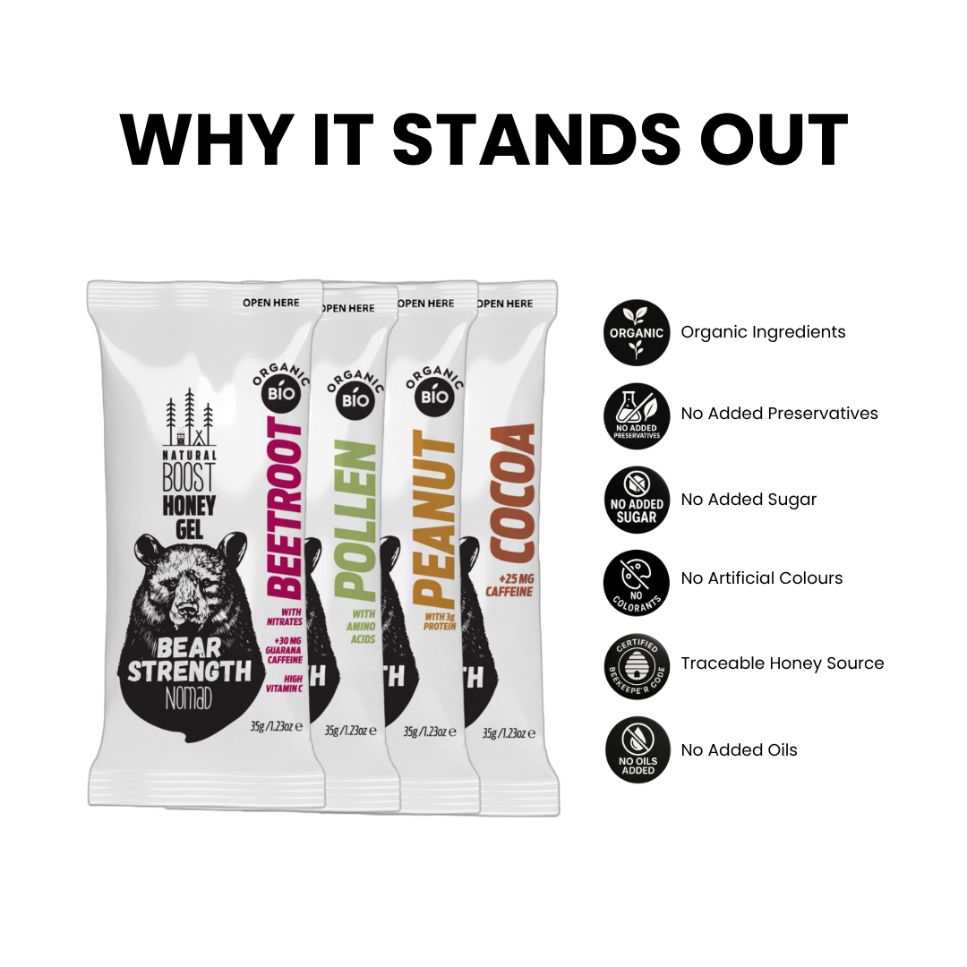 Match each flavour to your race phase. Pollen for muscle support. Cocoa for mental focus. Beetroot for endurance. Peanut for late-race recovery.
