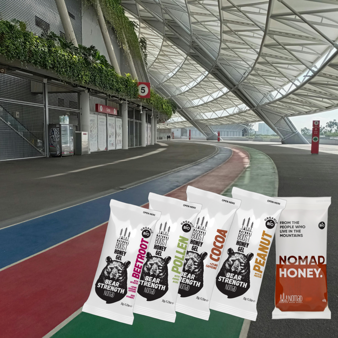 Take one gel 15 min before. Then every 45–60 min during. Organic honey means smooth energy — no spike, no crash, no gut distress in 33°C heat.